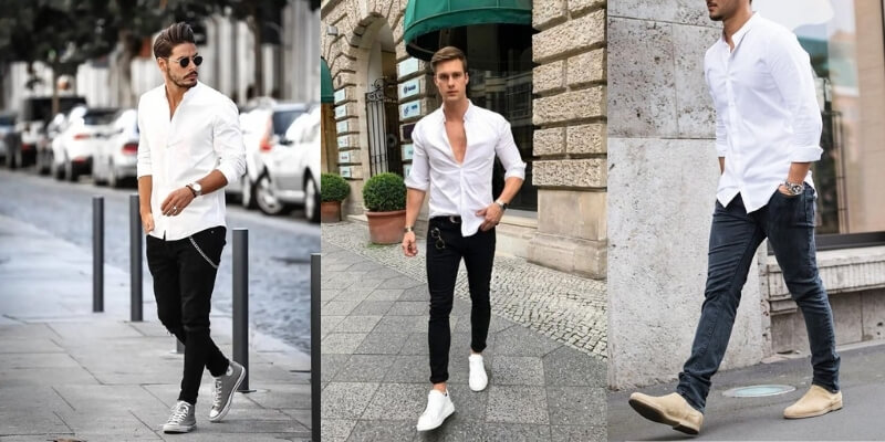 Cách phối đồ với áo sơ mi nam đầu tiên mà Cardina gợi ý cho các bạn là mix cùng với quần jean ống đứng hoặc quần jean ống côn. Những chiếc quần jean không hề khó tìm kiếm. Hầu như tất cả mọi người đều có ít nhất một chiếc trong tủ đồ.Đây là cách mix áo sơ mi được nhiều chàng trai chọn lựa. Vừa năng động, trẻ trung mà lại thoải mái. Một đôi giày thể thao hay một đôi dép sandal quai hậu là có thể tự tin đi học hay đi làm.